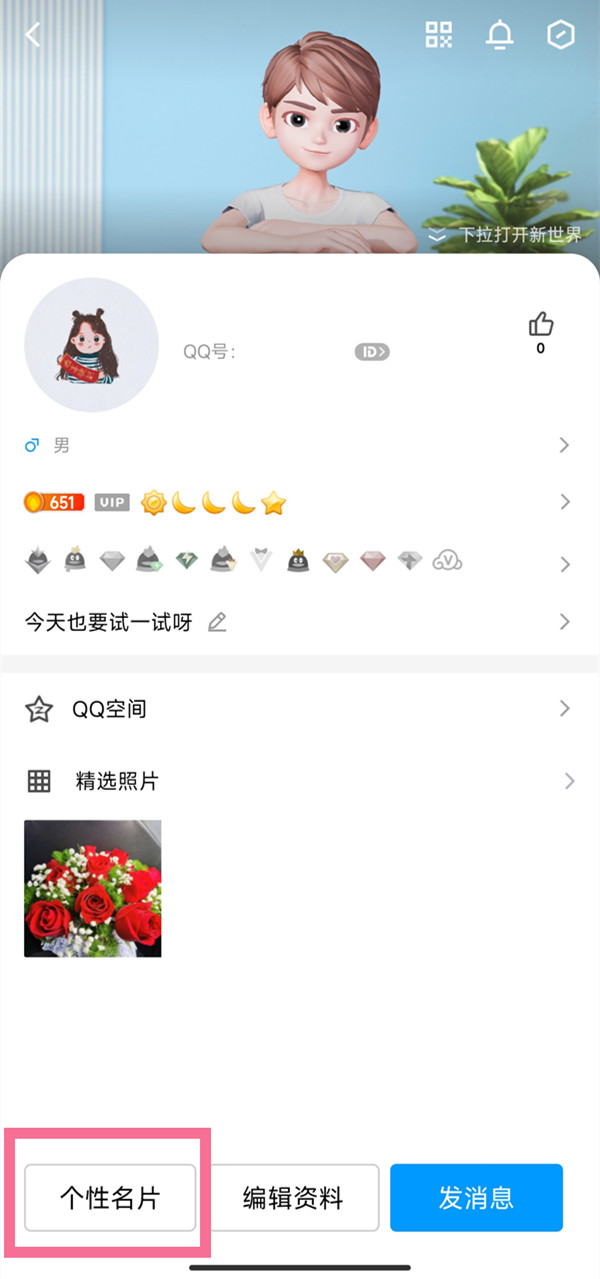 qq怎么设置无名片?qq名片功能为系统默认功能,不可以设置成无名片。但可以为名片设置背景。设置方法如下: