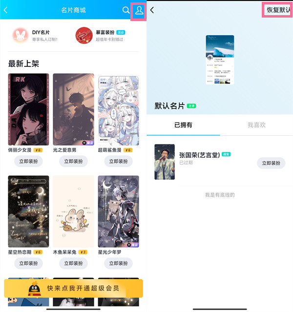 如果想要取消设置的名片背景,可点击右上角的人像图标,点击【恢复默认】即可。