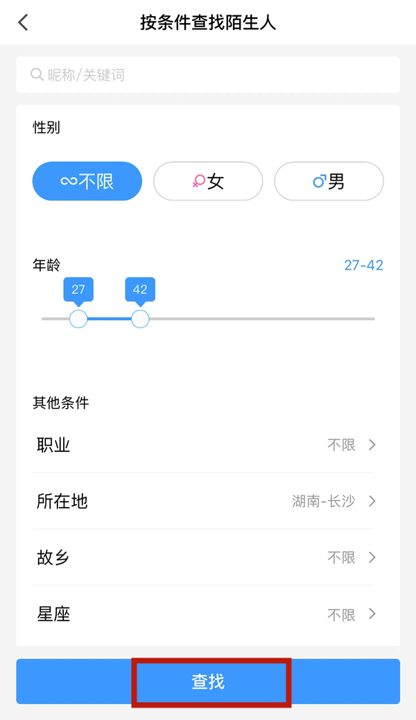 4、在弹出的按条件查找陌生人页面中,设置要搜索的陌生人“性别、年龄段、职业、所在地”等信息,然后点击【查找】。