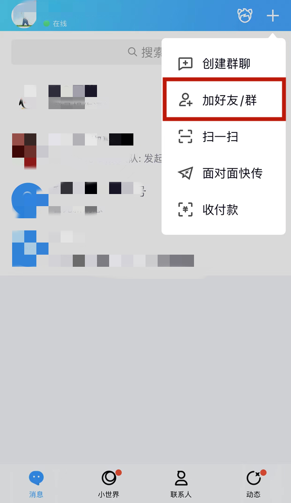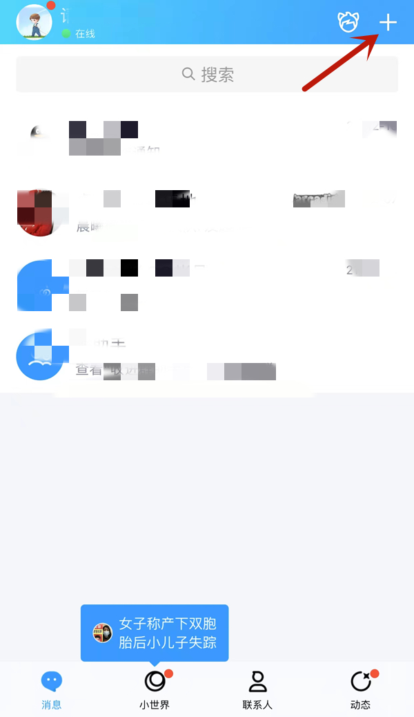 qq怎么加陌生人为好友?1、在手机QQ的消息页面,点击右上角的【+】号。
