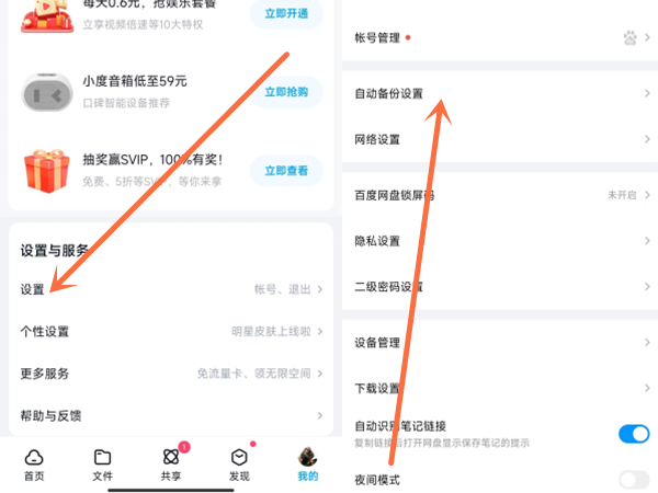 1、打开百度网盘app,在我的界面点击设置,再点击自动备份设置。