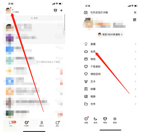 1、打开手机QQ,点击左上角头像,点击【点我开通会员】。