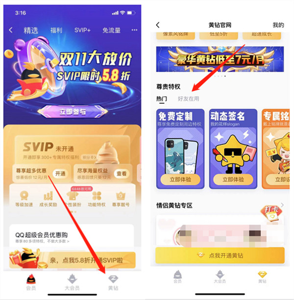 2、点击底部的黄钻,在“尊贵特权”一栏点击【好友在用】。