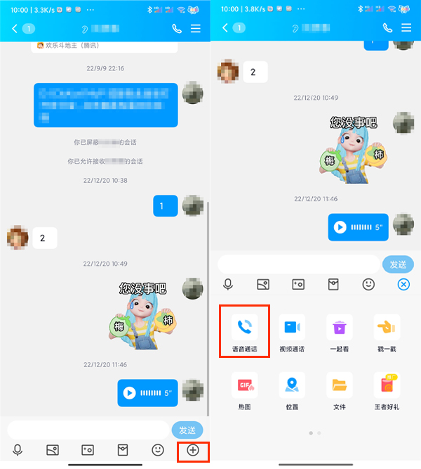 2、点击输入框后的加号,点击语音通话。