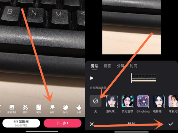 2、拍摄完后,点击特效,选择无,再点击确定图标即可。