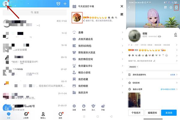 1、打开手机QQ,点击左上角的个人头像,再次点击个人头像,点击右上角的设置图标。