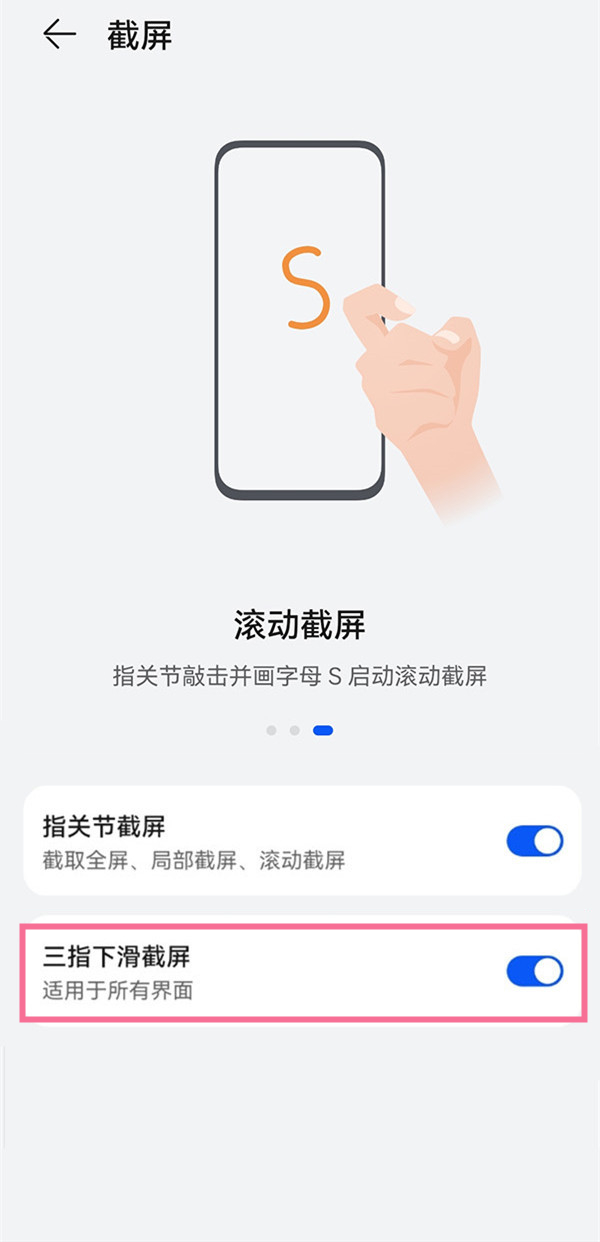 3、打开三指下滑截屏右侧的开关,在屏幕上使用三指下滑即可截屏。
