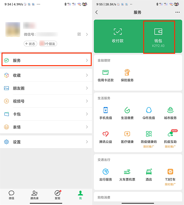1、打开微信,点击我,点击服务,点击钱包。