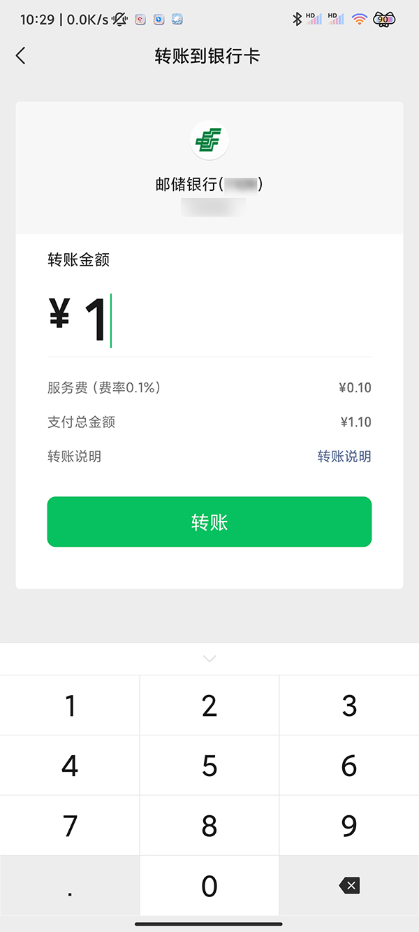 4、输入转账金额,点击转账,支付方式选择银行卡输入密码即可。