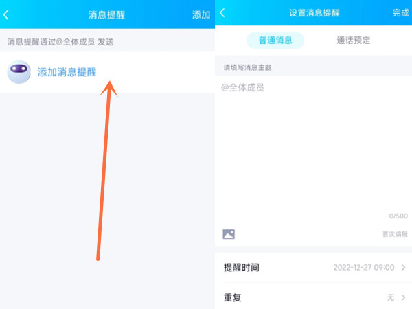 3、点击添加消息提醒,设置定时消息内容,提醒时间,重复周期等后点击完成。