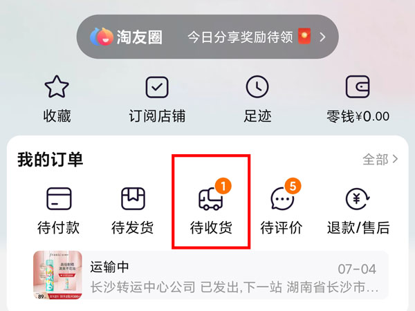 1、打开淘宝,点击【我的淘宝】,点击【待收货】。