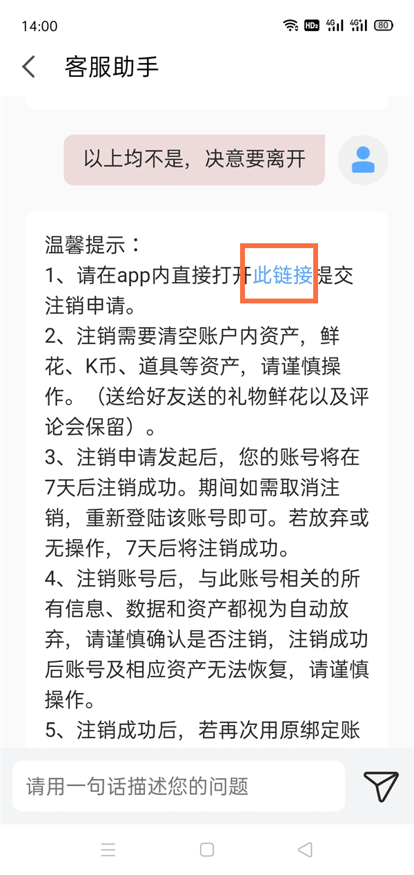 4、在客服助手页面输入注销账号后,点击蓝色字体的此链接。