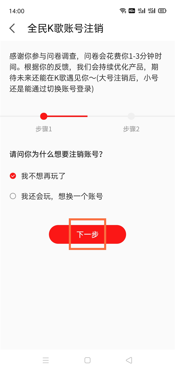 5、点击账号注销后,勾选注销原因,并点击下一步。