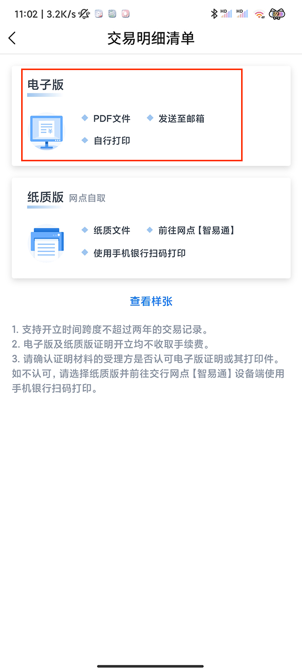 3、选择电子版,按提示操作即可成功导出流水明细。