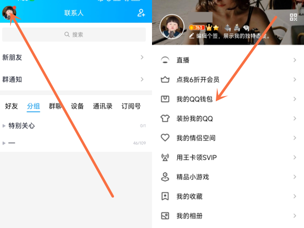 1、打开手机QQ,点击左上角的头像,再点击我的QQ钱包。