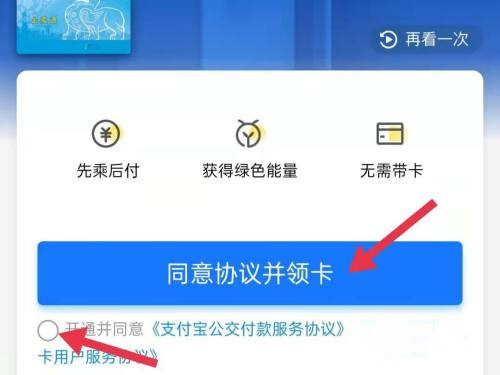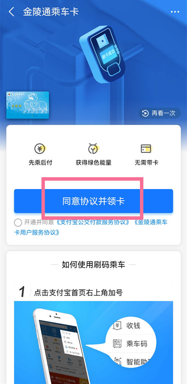 3、在金陵通乘车卡页面点击“同意协议并领卡”,勾选协议进入服务授权页面。