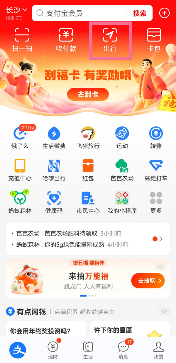 南京公交车怎么支付1、打开手机支付宝,点击首页的出行。