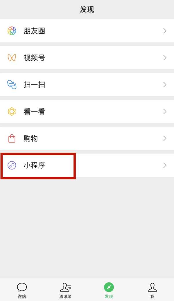 1、进入手机的微信,在【发现】界面中,点击【小程序】进入。