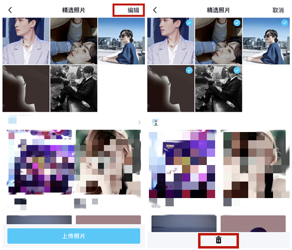 4、点击右上角的【编辑】,选定要关闭的照片,点击下方的【删除】即可。