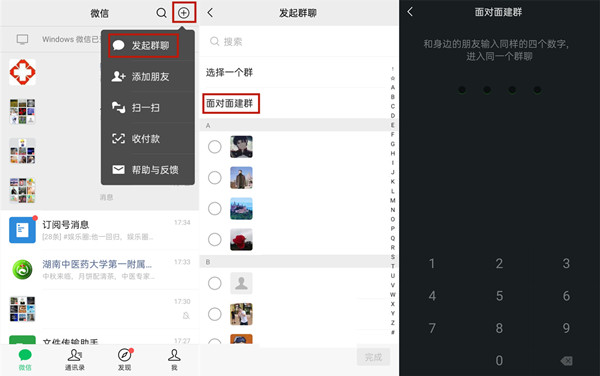 面对面建群:打开微信,点击右上角【+】图标,点击【发起群聊】,点击【面对面建群】,输入加群密码即可入群。
