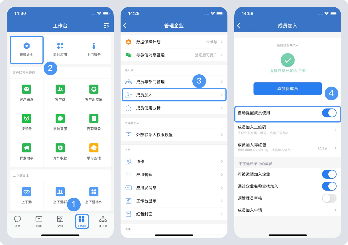 在【手机端->工作台->管理企业->成员加入】中开启【自动提醒成员使用】开关。