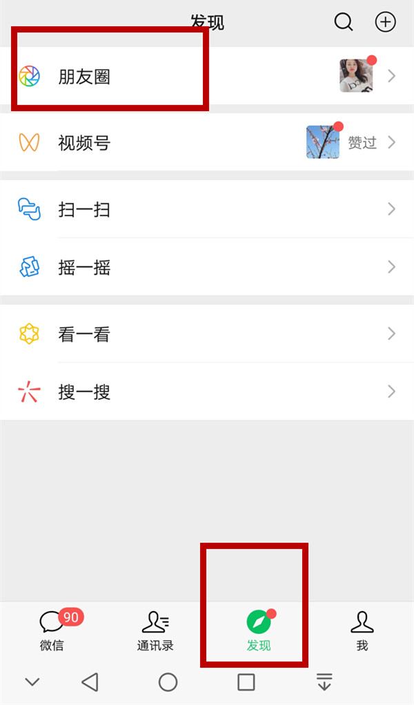 1、打开微信,点击【发现】,选择【朋友圈】。