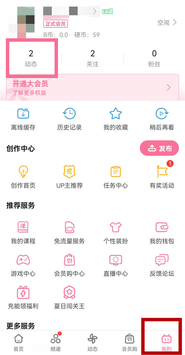 1、 打开哔哩哔哩,在【我的】界面点击【动态】。