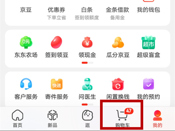 1、打开京东,进入下方的【购物车】。