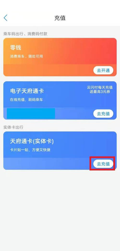 3、充值页面选择需要的天府通实体卡项目,点击去充值。