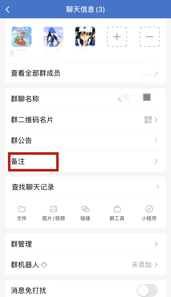 3、进入到【聊天信息】页面后,点击【备注】选项。
