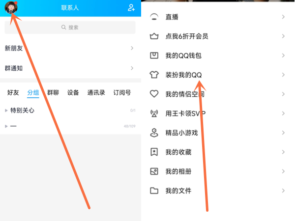 1、打开手机QQ,点击左上角头像,再点击装扮我的QQ。