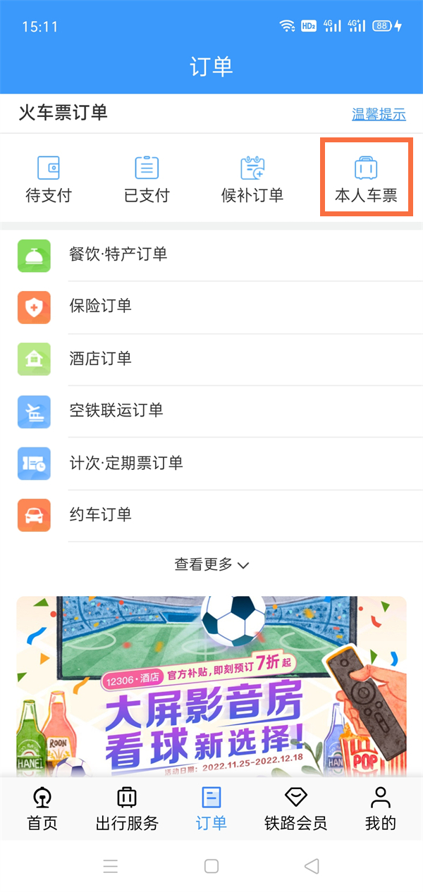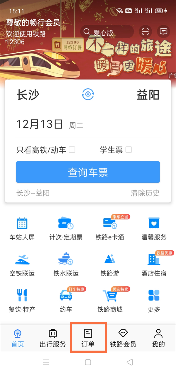 1、打开铁路12306,登录自己账号后,点击订单。