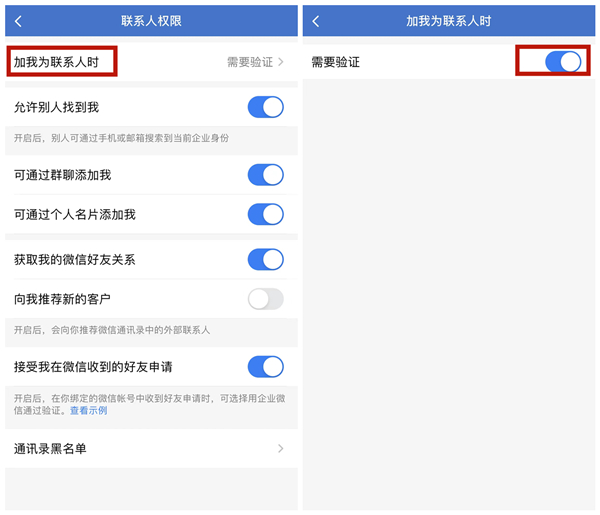 3、在联系人权限界面,点击【加我为联系人时需要验证】把右侧开关关闭,就能自动同意好友申请。
