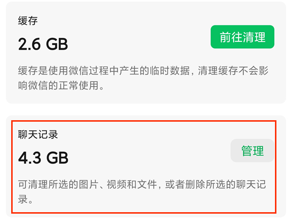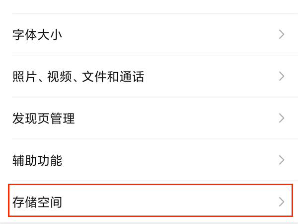3、点击存储空间,点击聊天记录进入可以查看接收的微信文件。