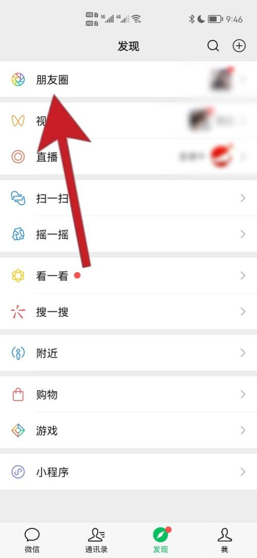 1、打开手机微信,在“发现页”点击进入朋友圈。