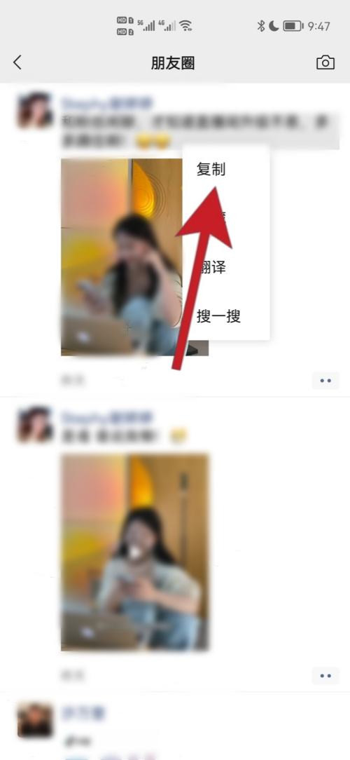 2、长按需要转发的朋友圈文字,点击【复制】。