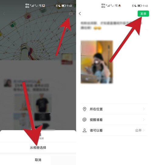 4、返回朋友圈首页,点击右上角相机图标,选中视频并粘贴文字后【发表】即可。