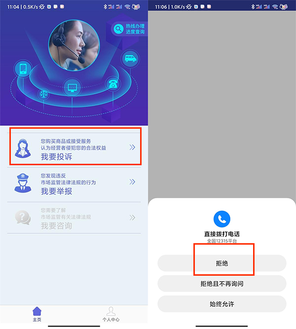 1、登录全国12315平台app,点我要投诉,在弹出的直接拨打电话弹窗上点拒绝。