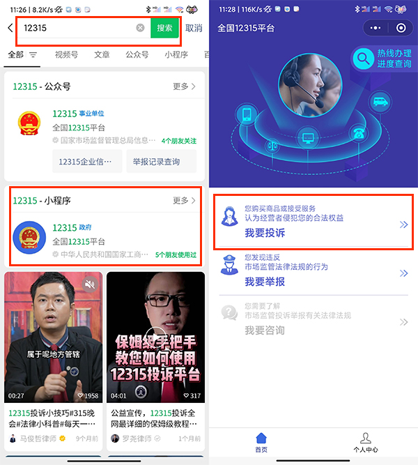 ️在小程序在线投诉方法:打开微信,搜索12315,并进入全国12315平台小程序,然后按照上文给出的与通过app在线投诉操作步骤操作即可投诉。
