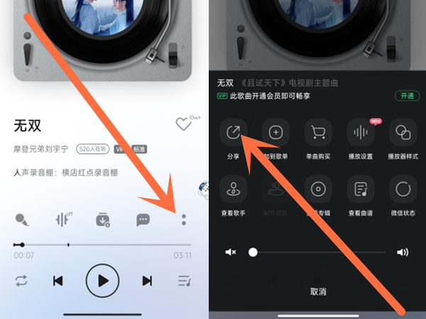 1、打开QQ音乐,在播放界面点击两个点,再点击分享。