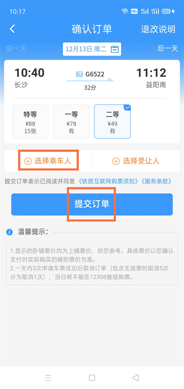 3、选择乘车人后,点击提交订单并付款即可。