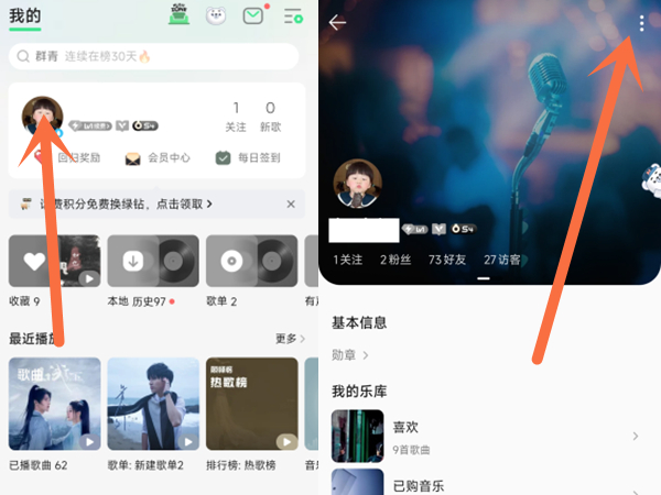 1、打开QQ音乐,在我的界面点击头像,再点击右上角三个点进入主页设置界面。
