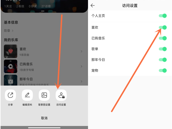 2、点击访问设置,再将喜欢的开关关闭即可。