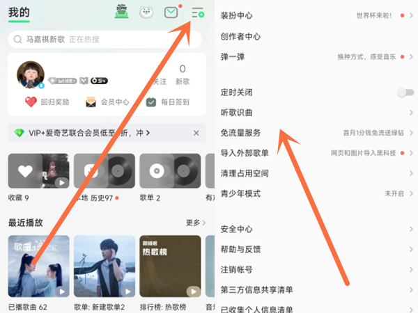 1、打开QQ音乐app,点击右上角设置图标,再点击免流量服务。