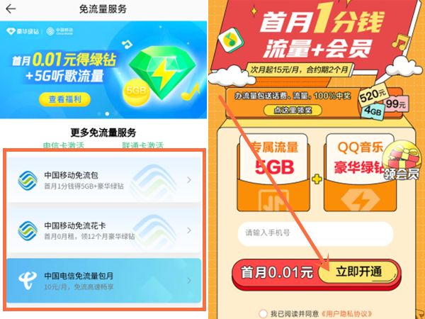 2、选择需要开通的类型,输入电话号码,再点击立即开通进行支付即可。