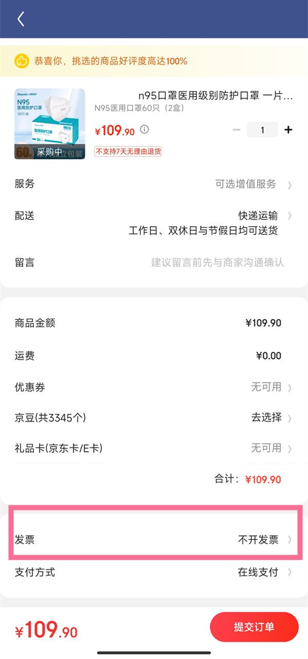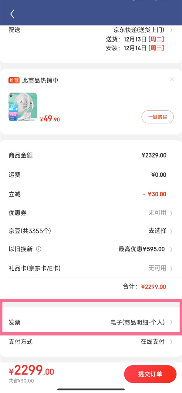 1、打开京东APP,选定商品后在订单提交界面点击【发票】。