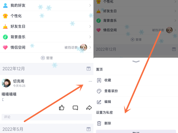 3、点击说说右侧的三个点,再点击设置为私密即可。
