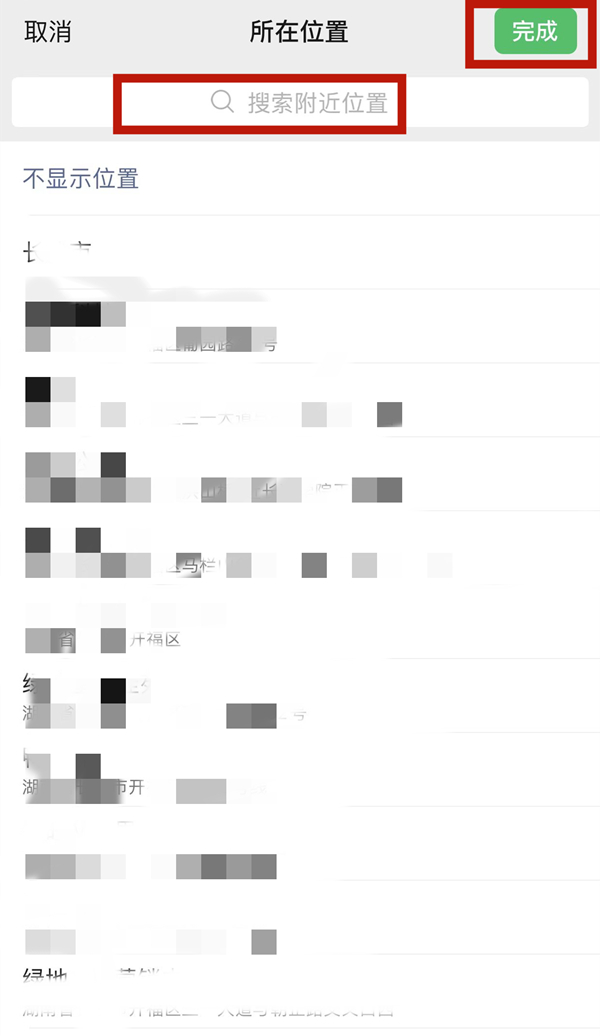 4、在所在位置界面,点击【搜索框】输入想要的地址,勾选后点击完成即可。