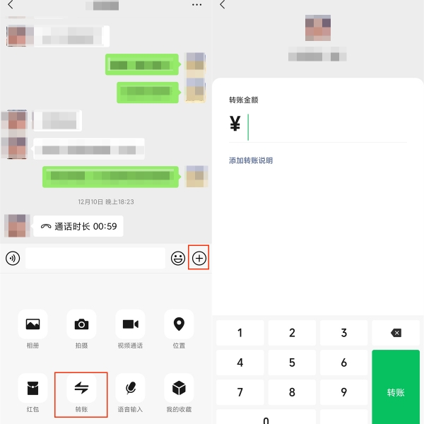 2、点击聊天框后面的【+】号,点击转账,输入金额,点击转账,选择支付方式,输入支付密码即可。