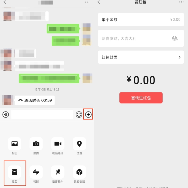 2、点击聊天框后面的【+】号,点击红包,输入金额,点击塞钱进红包,选择支付方式,输入支付密码即可。
